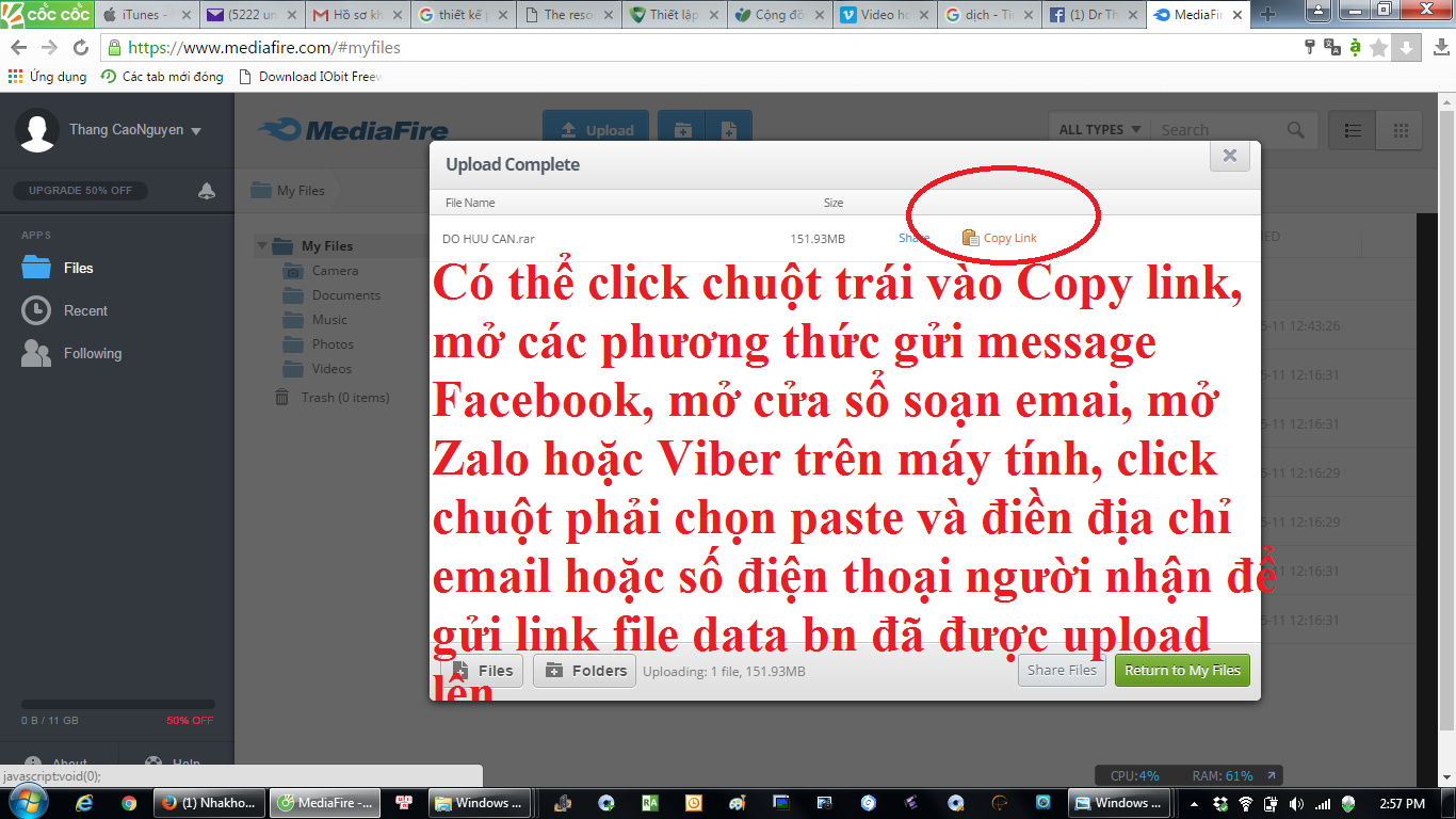Bước 3: Sau khi đã có một tài khoản Mediafire, login vào tài khoản này để upload file lên lưu trữ và share link cho ngưởi nhận